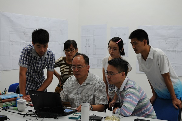 祝守新教授的每一天总是在忙碌中度过的。据统计,他每年的实际教学工作量平均在350课时。然而忙碌的工作并没有使他停下脚步,除了自己的日常教学工作,他还主动去指导学生和青年老师,把做好“传帮带”的工作职责揽在肩上。他于2009年到湖师院工作,第二年就开始指导学生参加省和国家的机械设计竞赛。在准备学科竞赛的时候,作为指导老师的他一刻也没闲下来,一下班或是稍有空闲就去了解各组的进展情况。指导学生时每组他都挨个亲自看,提出问题启发学生寻找创新点,并适时给予帮助。祝老师说:“学科竞赛最艰苦的是想法的形成。机械创新竞赛最需要的就是好点子,想方案的过程并不是件容易的事,一个好的点子的形成不能简单地用时间来衡量,有时可能就是灵机一动,但这也需要先前许许多多的累积,更多的时候还需要冥思苦想”。在他的指导下,学生们在学科竞赛中取得了国家机械创新设计大赛一等奖、二等奖等诸多优异成绩。
