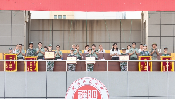 丁敢真宣读军训各类奖项获奖名单。其中先进个人349名、文明寝室177间;优秀组织奖4个,优秀方阵6个,内务优胜学院3个,拔河比赛获奖学院6个,特色展示奖2个,精神风貌奖4个。主席台领导为获奖集体代表颁奖。